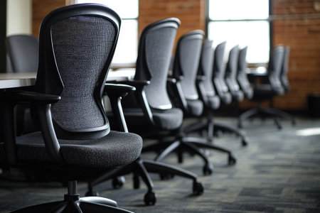 Row of Black Mesh Office Chairs in a Modern Workspace