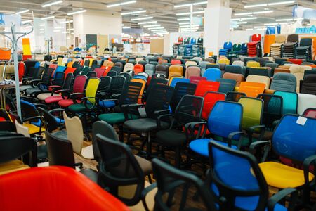 Rows of different office chairs in furniture store showroom, nobody. Comfort seats samples in shop, goods for modern interior