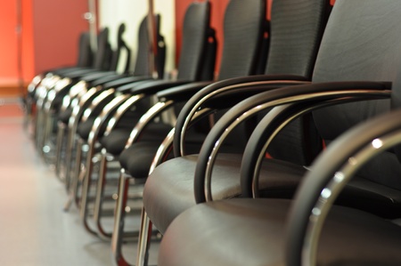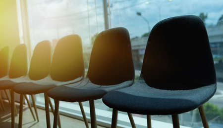 Empty black chairs stand in the foyer of a doctor or lawyer office. The concept of the end of the day or event