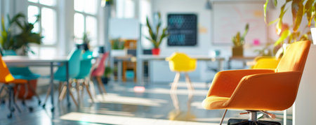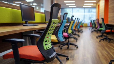 Vibrant office workspace featuring ergonomic chairs and sleek desks. The colorful design promotes comfort and productivity in a modern work setting. Perfect for creative environments.