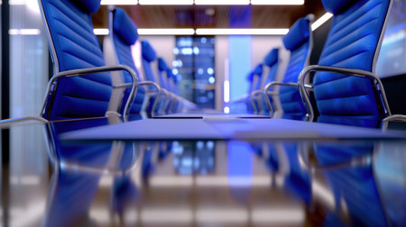 This image showcases a modern conference room featuring stylish blue chairs, sleek glass surfaces, and contemporary design elements that enhance productivity.
