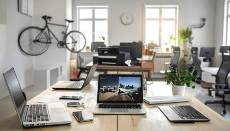 A modern office space filled with natural light and lush greenery creates a calming and productive work environment. This layout inspires creativity and collaboration.