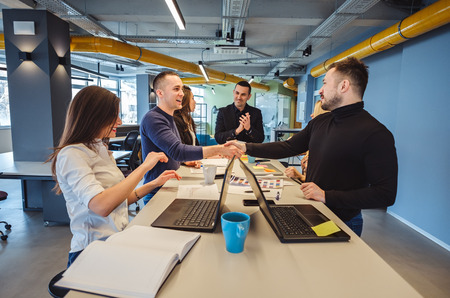 Business team having fun and clapping their hands at a negotiating table. Young man got up to greet an Asian woman speaker. Brainstorming in office concept.