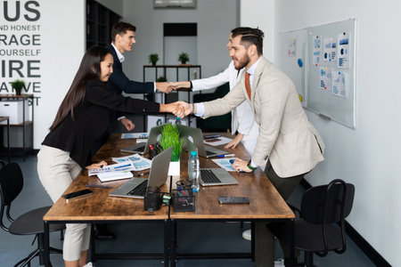 Two cheerful businessmen shaking hands while being in office together with their colleagues.