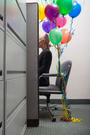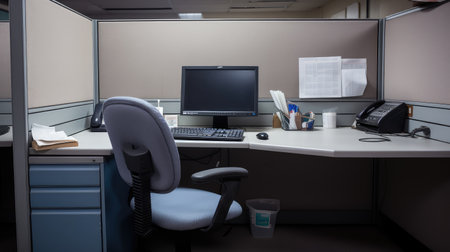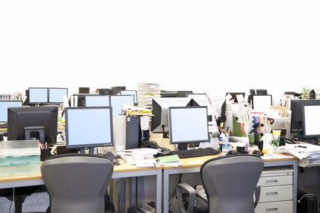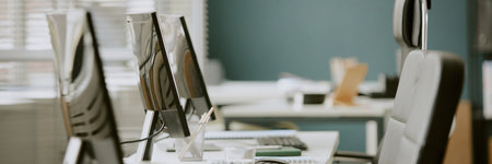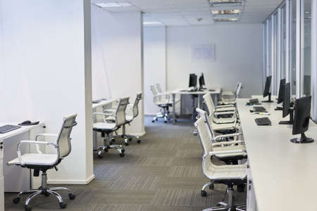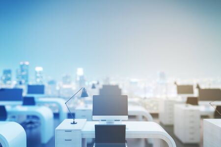 Empty workplace in the office. View of the office, no people. Empty workspace of a company with computer for their employees