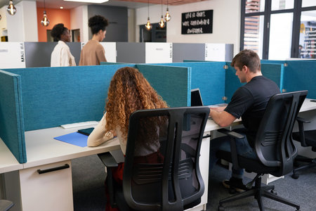 Four diverse coworkers in a modern open plan office, desk dividers, creative