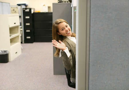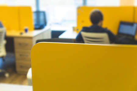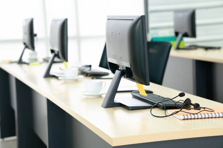 Blurred office interior space background in the workplace with computer shallow depth of focus of abstract background.