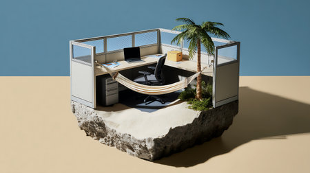 Modern Office design interior room with furniture in cutaway. Office cutaway. 3d rendering. Night time