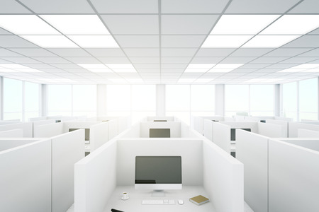 Modern coworking office interior with partitions and computers. 3D Rendering