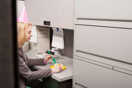 Header of Caucasian young men working at desks in modern office, both focused on laptops and paperwork, separated by partition, engaging in professional business tasks, coffee cups visible