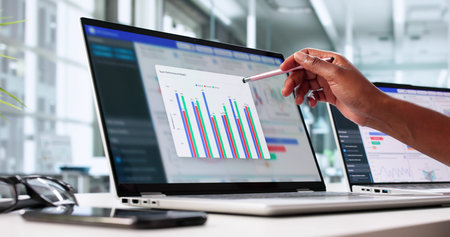 Top view closeup of young professional doing marketing research while using laptop and looking at data charts on screen