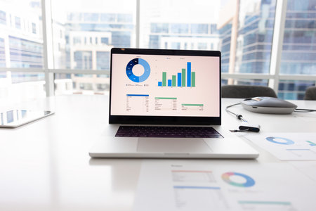 Portable computer with statistical infographics on a desk in an empty modern office. Project stats financial data sales charts on laptop in inside workspace, strategy analysis accounting concept.