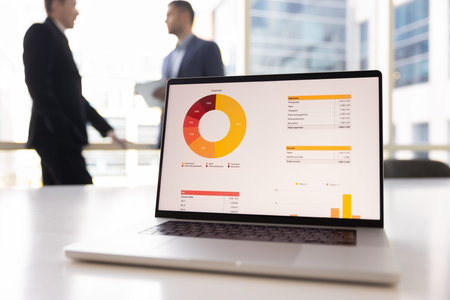 Financial analysis and corporate decision-making. Close up of laptop displaying colorful expenses data and budget graphs, in blurred background two businessmen, professionals engaged in conversation