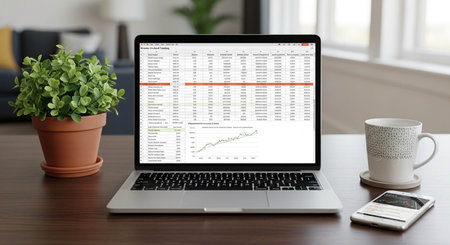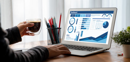 Analyzing business data and statistics on a laptop in a bright home office setting