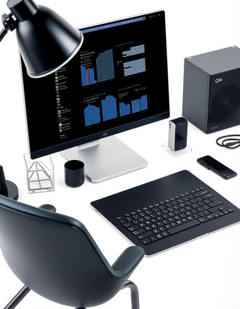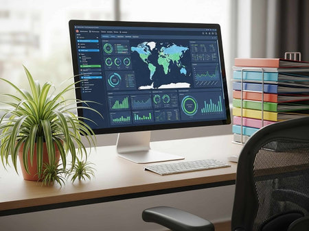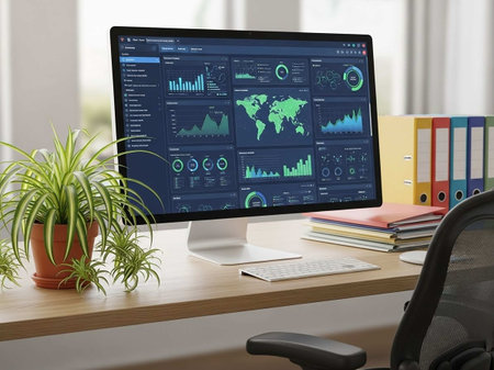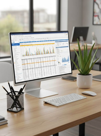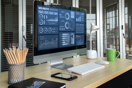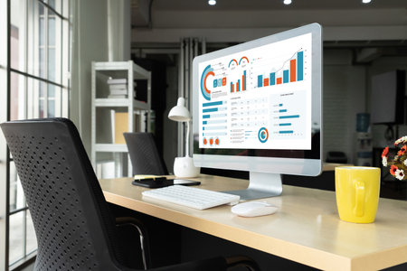 Modern office desk displays financial data on a monitor. The detailed analytics and graphs highlight business strategy and success, supported by data management and analysis tools.