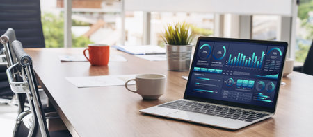 Empty corporate boardroom at night with digital display of performance metrics, graphs and projections on laptop. Modern office reflects business management.
