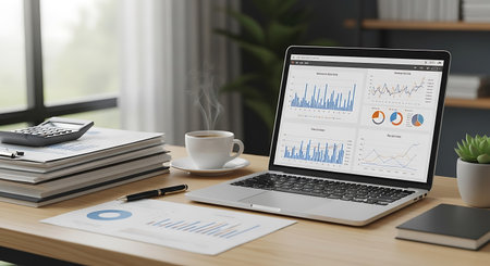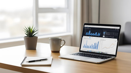Modern workspace with a laptop displaying business analytics on a light wooden desk