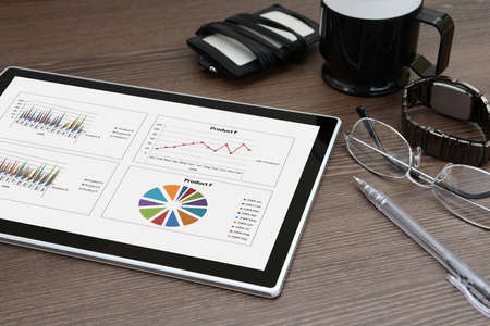 Laptop with graph chart report screen on work table. Home office or work space. Strategy analysis financial accounting concept