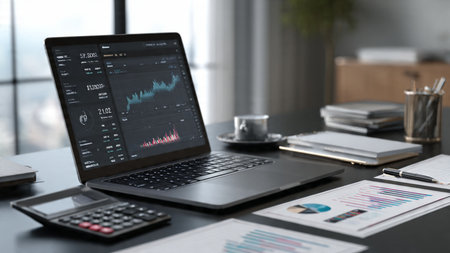 A workstation setup featuring market data on a laptop sits beside notes and coffee on a modern wooden desk.
