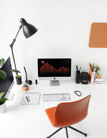 workplace with computer and lamp on white background, modern workplace concept