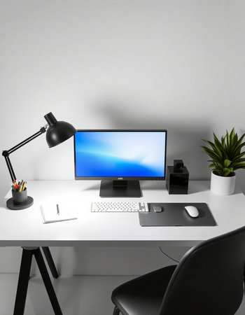 Modern workspace with computer, keyboard, mouse, lamp, and plant on white table.