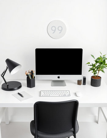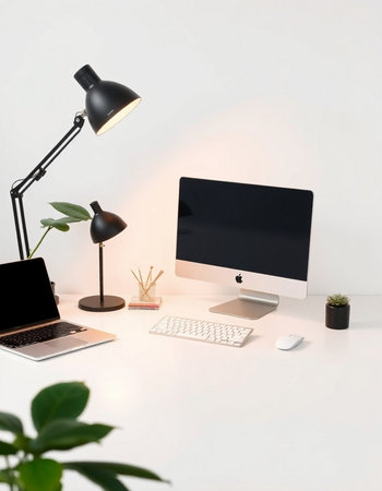 workplace with computer and plant on white table, modern office interior