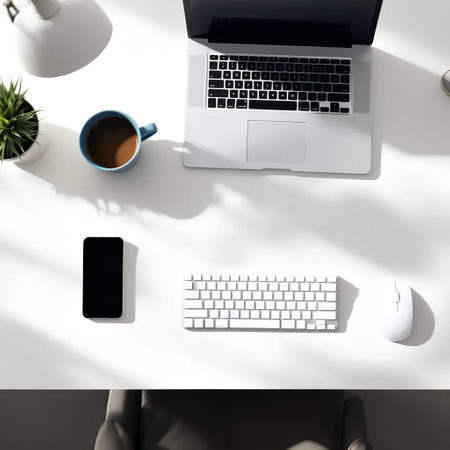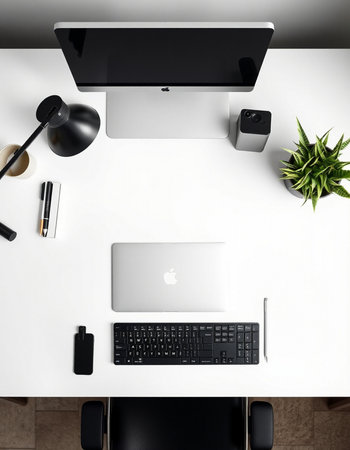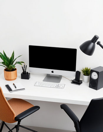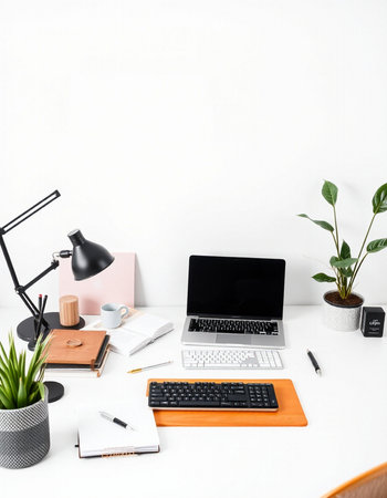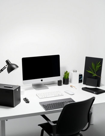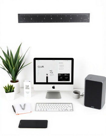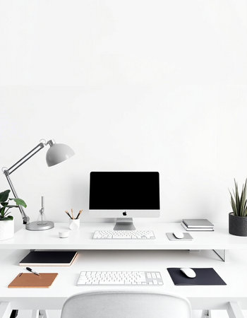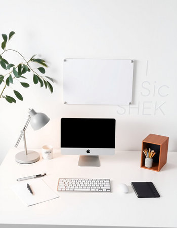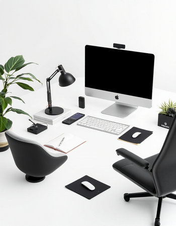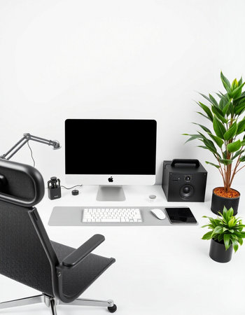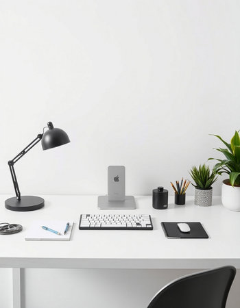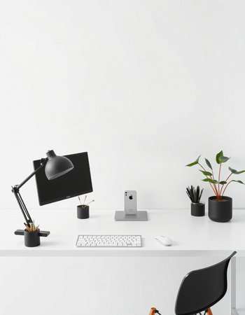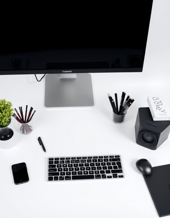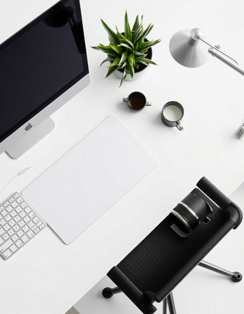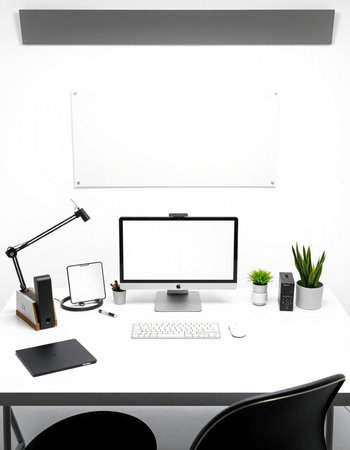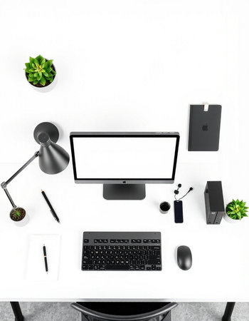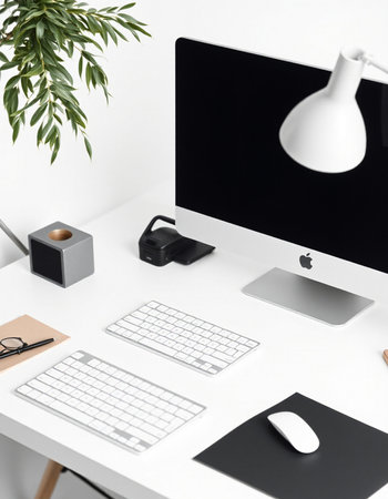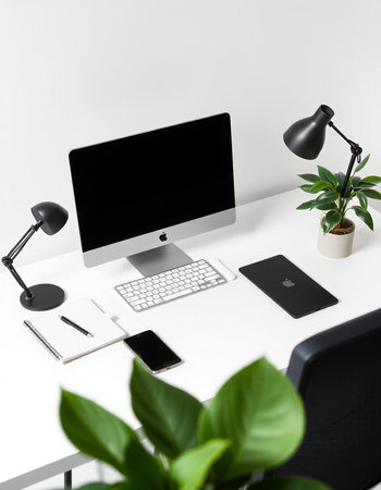 Modern white office desk with computer, keyboard, mouse, smartphone and plant.