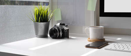 Cropped shot of modern office desk with computer device, smartphone, camera, supplies and decorations beside window