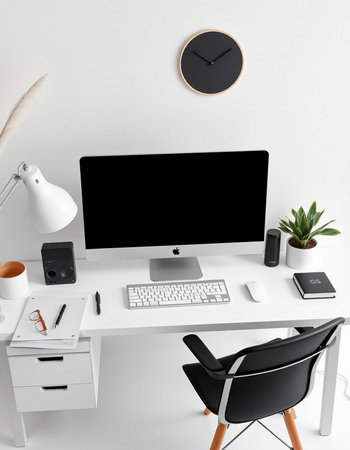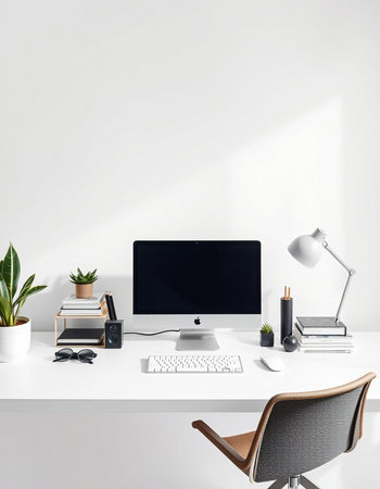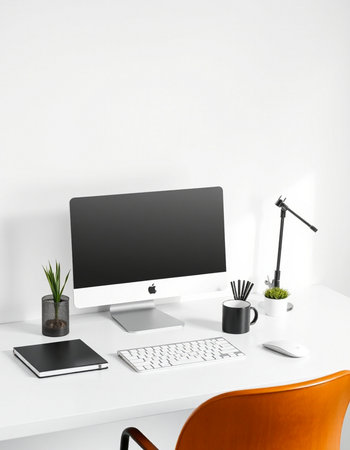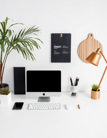 Modern workplace with blank screen computer, stationery and decorations on white table