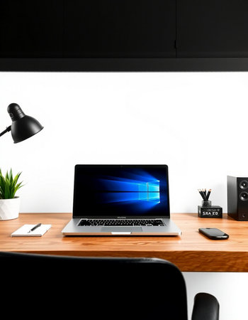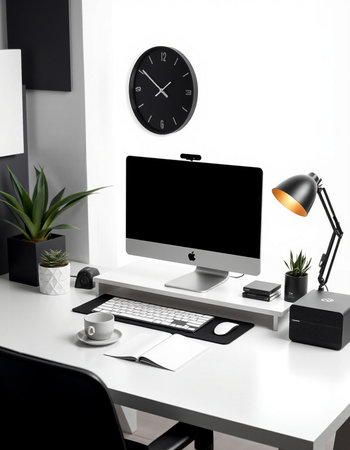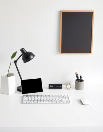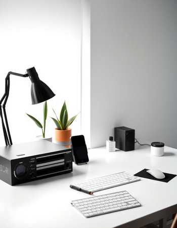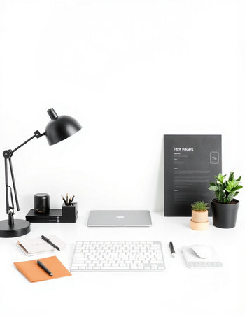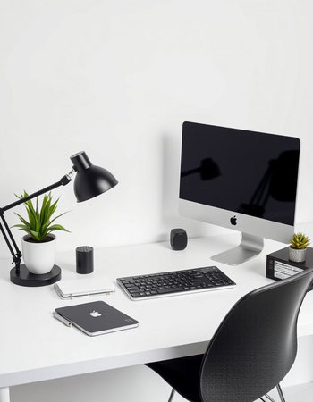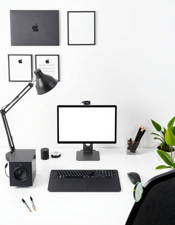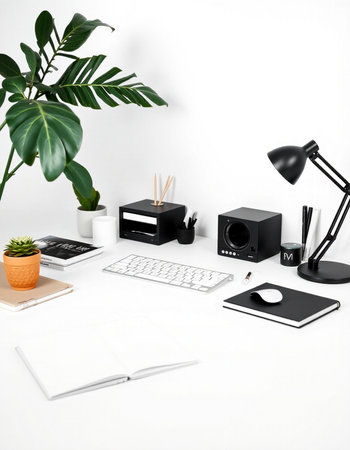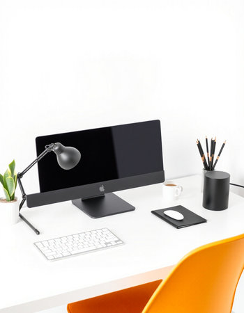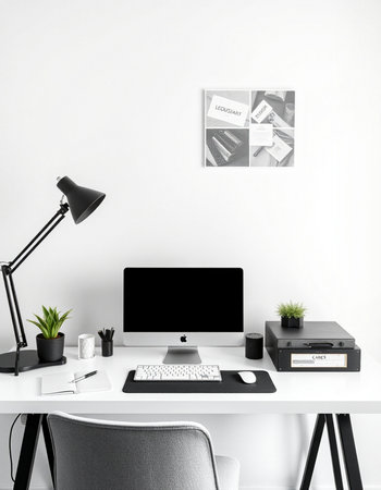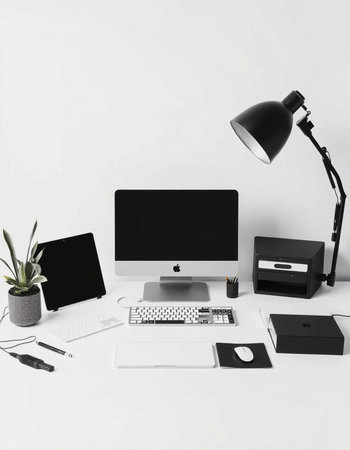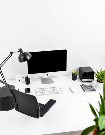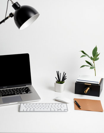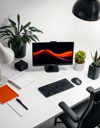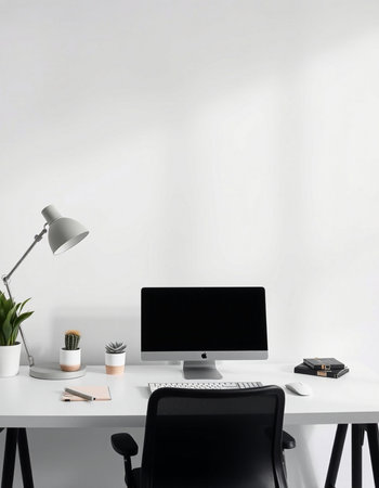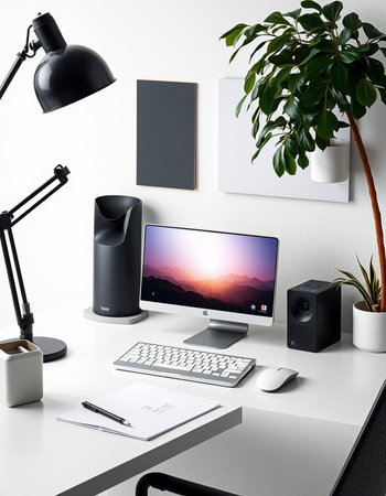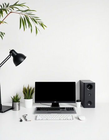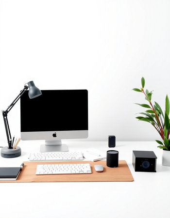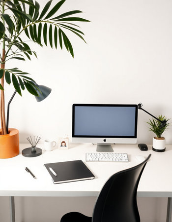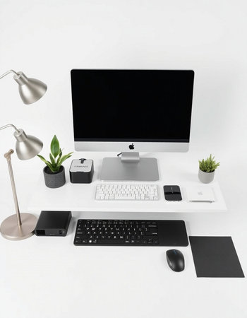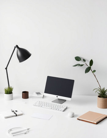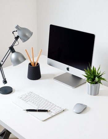 Modern workplace with computer, mouse, lamp and plant on white desk