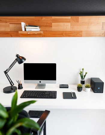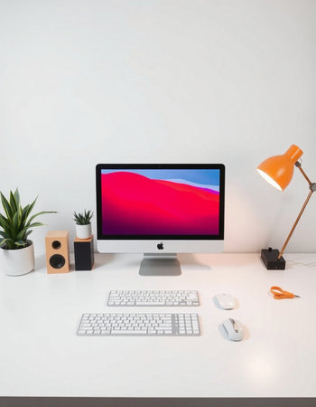 Modern workspace with computer, keyboard, mouse, lamp and plant.