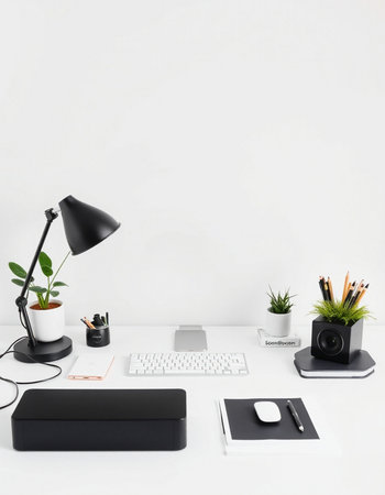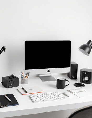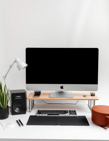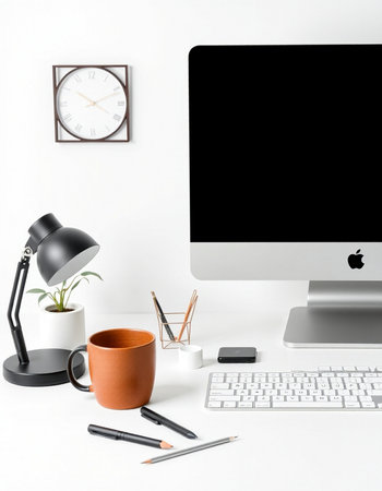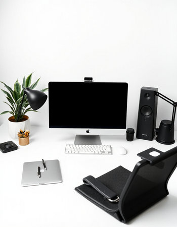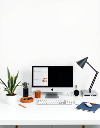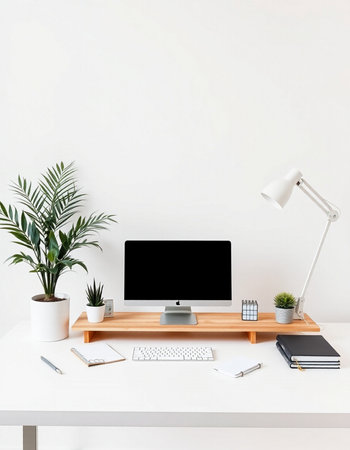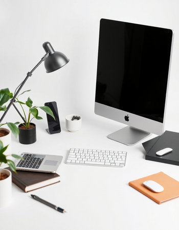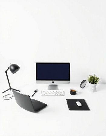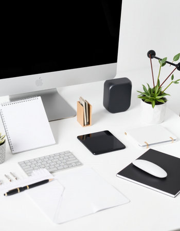 Modern workspace with blank screen computer, stationery and accessories on white table