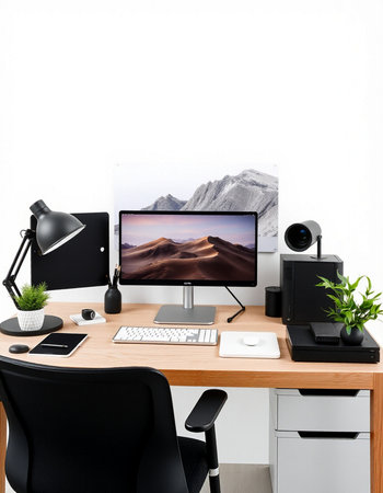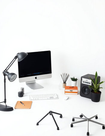 Modern workplace with computer, keyboard, mouse, camera and plant on white background. 3D Rendering