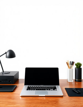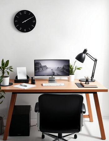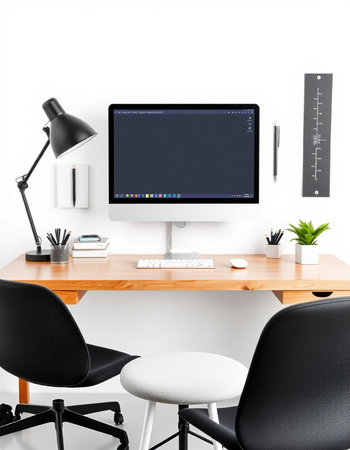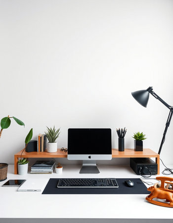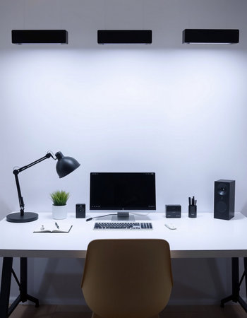 Modern workspace with computer, supplies and copy space on white wall. Mock up