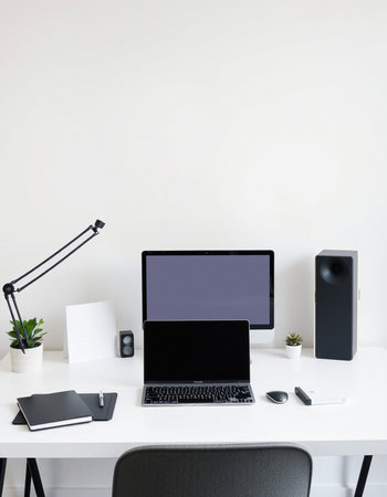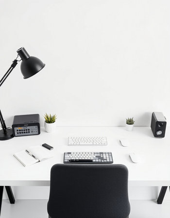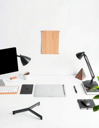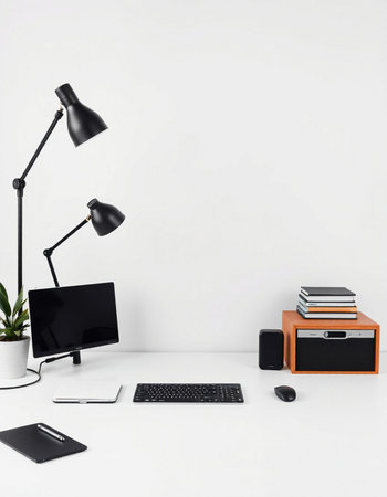 Minimalistic workspace with computer, books, stationery and lamp on white wall background