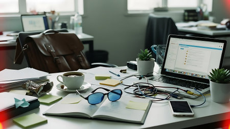Minimalistic office workspace with laptop, coffee cup, stationery and copy space on white wall. 3D Rendering
