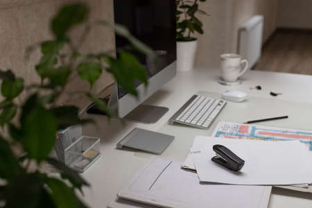 home Office. Desktop with open document folders, computer and keyboard. coronavirus quarantine concept. side view. selective focus