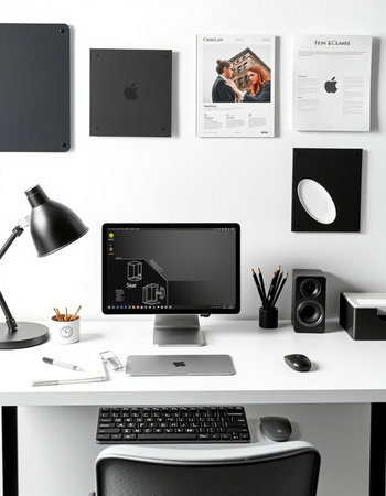 Minimalist workspace with computer, lamp and decorations. 3D render