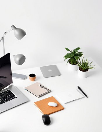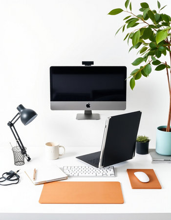 Modern workspace with computer, keyboard, mouse, notebook and plant on white background