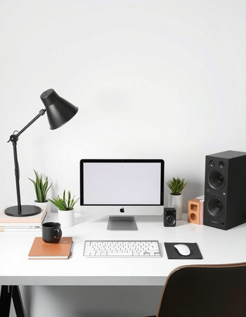 Minimal workspace with computer, coffee cup, speaker, speakers and table lamp. 3d rendering.