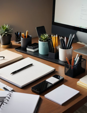 Modern workspace with computer, supplies and decorations. 3d rendering.