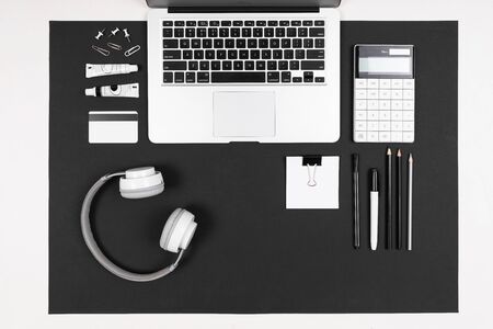 Desktop with laptop, earphones, calculator, pens, pencils, card, phone isolated on black and white background