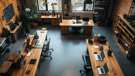 Top view on modern open space office with comfortable workplaces. Overhead view. By generative Ai