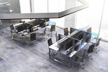 Stylish modern coworking room interior with pc computers on desk, panoramic window