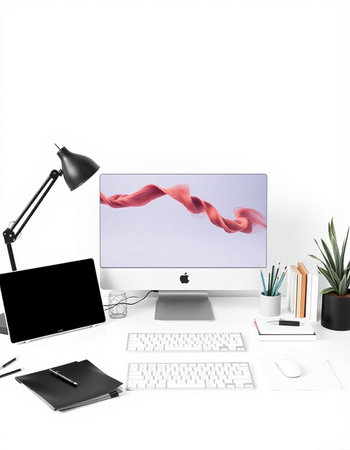 Modern workspace with computer on white table.