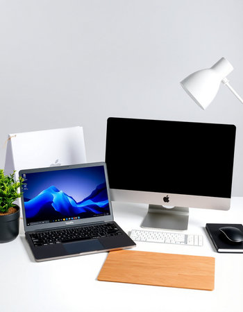 Modern workspace with computer, laptop and mouse.