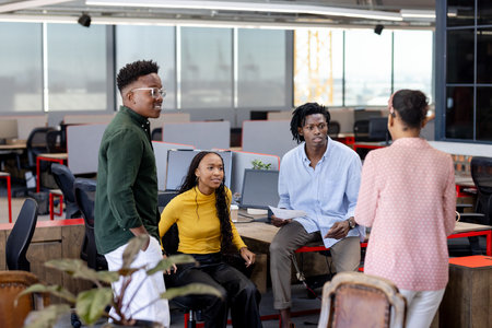 Portrait of happy biracial colleagues by advisors discussing over document at modern workplace. unaltered, business, teamwork and modern office concept.