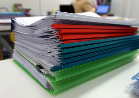 Pile of unfinished documents on office desk folders. Business papers or document is written. Business offices concept.