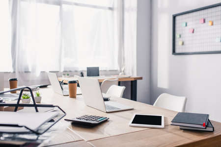 Office desk with laptop, tablet and other items. Workplace in modern office