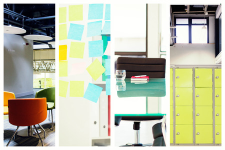 Office in loft style with columns. Many workplaces with computers, shelves and lockers